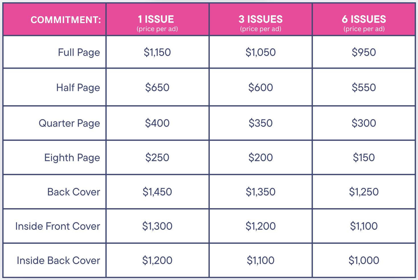 This chart shows the cost per ad. We offer discounted rates when you commit to 3 issues or 6 issues.