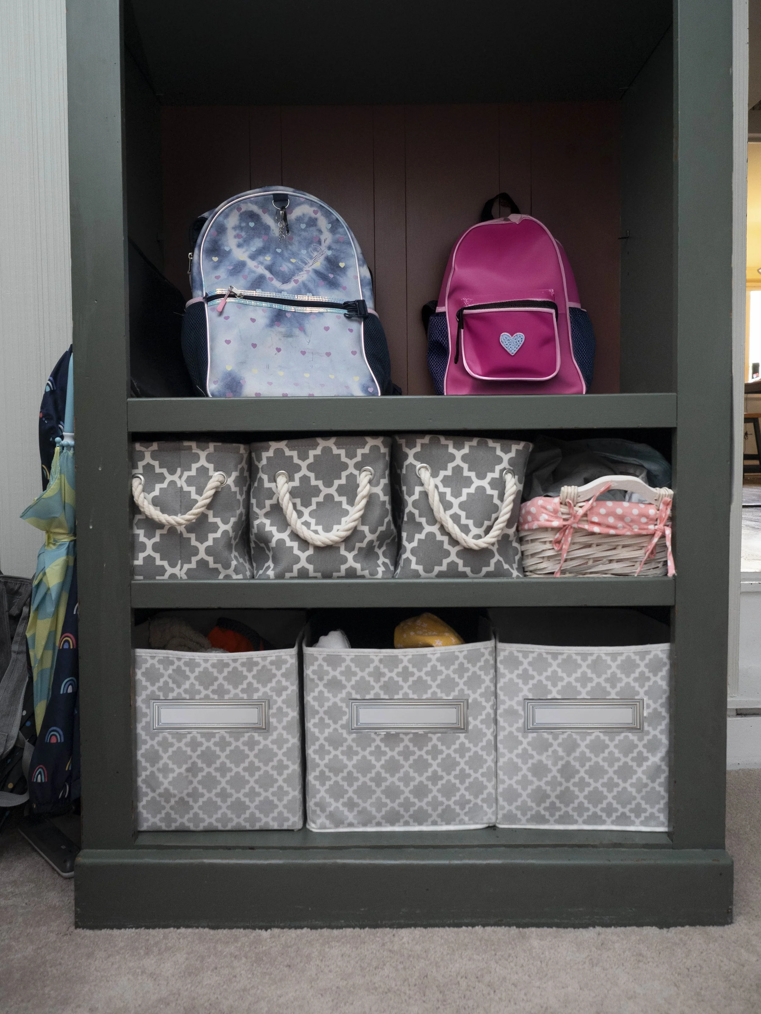 Modified bookshelf for school gear drop zone. | Photo by Lauren Wojtalewski